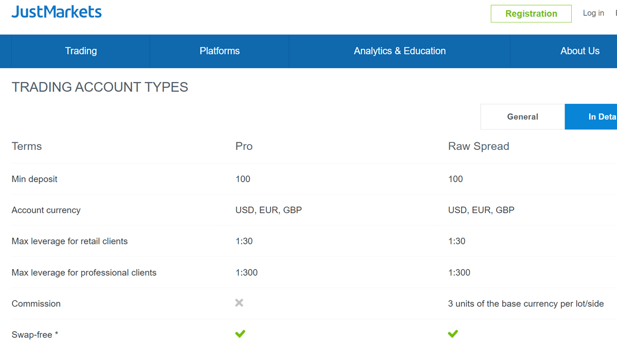 JustMarkets has multiple account types which you can select during the signup proceed. These accounts include a standard account, Pro account, and Raw spread account.